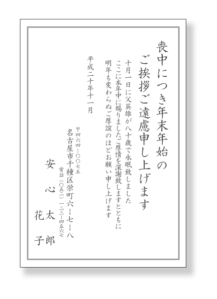 | 喪中はがき印刷(大礼紙・銀線枠付)120枚セット【喪中ハガキ】【喪中葉書】【年賀欠礼はがき】  価格:¥3870-[税込] | ||||