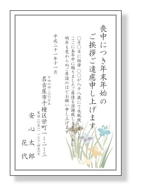 | 喪中はがき印刷(上質紙・銀線枠付)【ワンポイント入り】50枚セット【喪中ハガキ】【喪中葉書】【年賀欠礼はがき】  価格:¥3000-[税込] | ||||