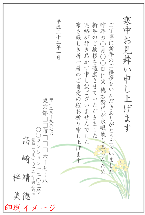 | 注文画面の最後に備考欄がございますのでそちらに下記の内容を印刷必要項目のみご記入下さい。ご逝去された月、又は月日故人との関係、故人の名前又は氏名、年齢等はがきの投函月(通常寒中見舞いはがきは1月になります。)〒番号、住所、電話番号、差出人(連名可)ワンポイントの確認ページ寒中見舞いはがきのワンポイント絵柄 寒中見舞いはがきにワンポイントの絵柄が選択できます。 図柄をクリックしますと実際の寒中見舞いはがきの印刷イメージが見られます。 01 桔梗(ききょう) 02 福寿草 03 藤袴(ふじばかま) 04 白椿(つばき) 05 蓮(はす) 06 水仙 07 紅梅 08 杜若(かきつばた) 09 柊(ひいらぎ) 10 冬景色 11 いろり 12 富士山 13 蕗のとう 14 雪割草 15 ホオズキ 16 桜 17 彼岸花 18 つわぶき 19 秋桜 20 菊 寒中お見舞いはがき 下記の文例【1〜4】よりお選び下さい。 -------------------------------------------------------------- ■ 文例1.故人の逝去月日・お名前・年齢等を印刷する ■ 文例2.故人の情報を印刷しない(故人情報無しA)  ■ 文例3.故人の情報を印刷しない(故人情報無しB)  ■ 文例4.喪中の情報を印刷しない              ■ ■ ■ ■ 文例をお選びの上備考欄に文例番号をご記入下さい。 オリジナル文章をご希望の場合は備考欄に原稿をご記入下さい。 |
